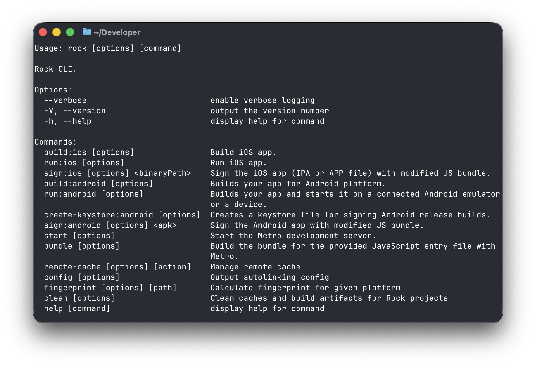 – Device selection is now automatic when no devices are connectedThe CLI integrates with Rock's Remote Cache system to speed up builds by reusing cached native artifacts. When available, the CLI will automatically download and use cached builds (APK/AAB/APP/IPA) instead of rebuilding from scratch.